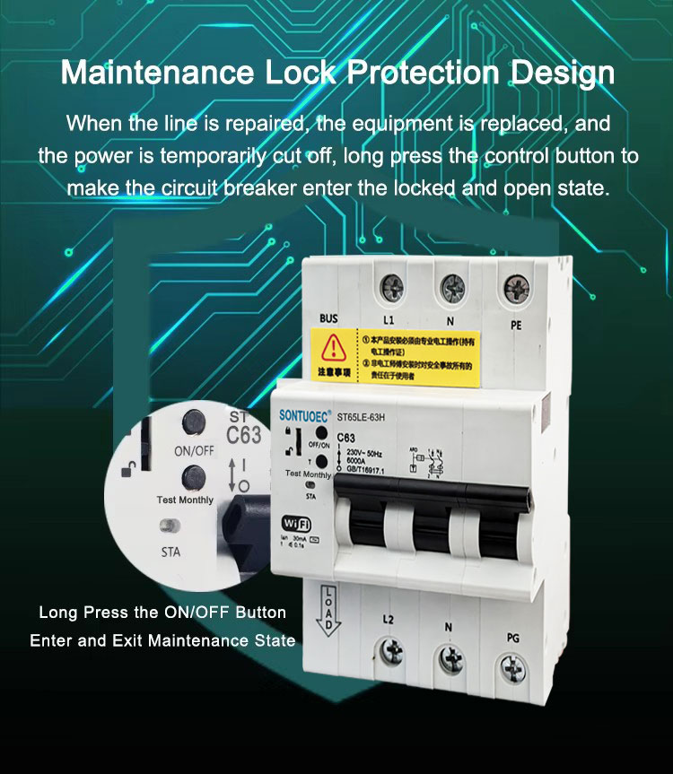 Deze WiFi 4G Tuya ST65Le-63H-serie Multi-functionele RCBO Intelligente stroomonderbreker is geschikt voor 50Hz/60Hz, 230/400V 0 ~ 125A-circuit die de functie hebben zoals overbelasting, kortingscircuitbescherming en lekbescherming. Ondertussen heeft deze intelligente rescloserende stroomonderbreker de functie als geschakelde OOF/op globaal afstandsbediening door een smart mobiele telefoon.